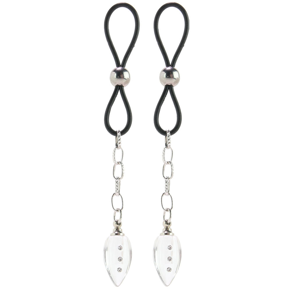 A truly gorgeous crystal-tipped set, these dazzling tassels will absolutely, 100%, beyond-definitely command an object of desire's full and undivided attention. Slipping easily over the peaks of the nipples, a plush silicone cinch grips gently to secure sparkly teardrop pendants. Simple to adjust, the cinch tightens and loosens by sliding a silvery bead up or down. Nickel free.